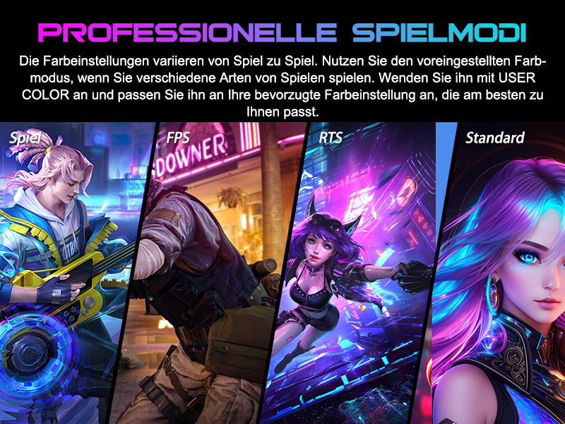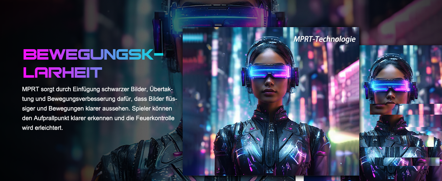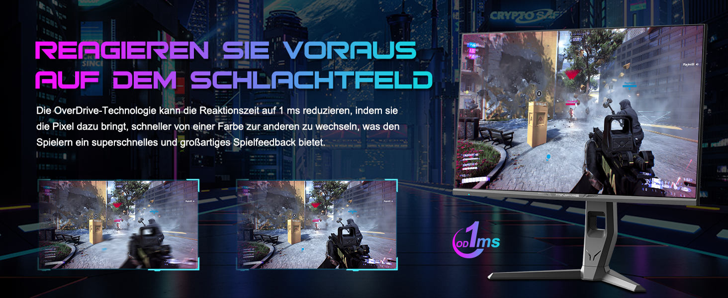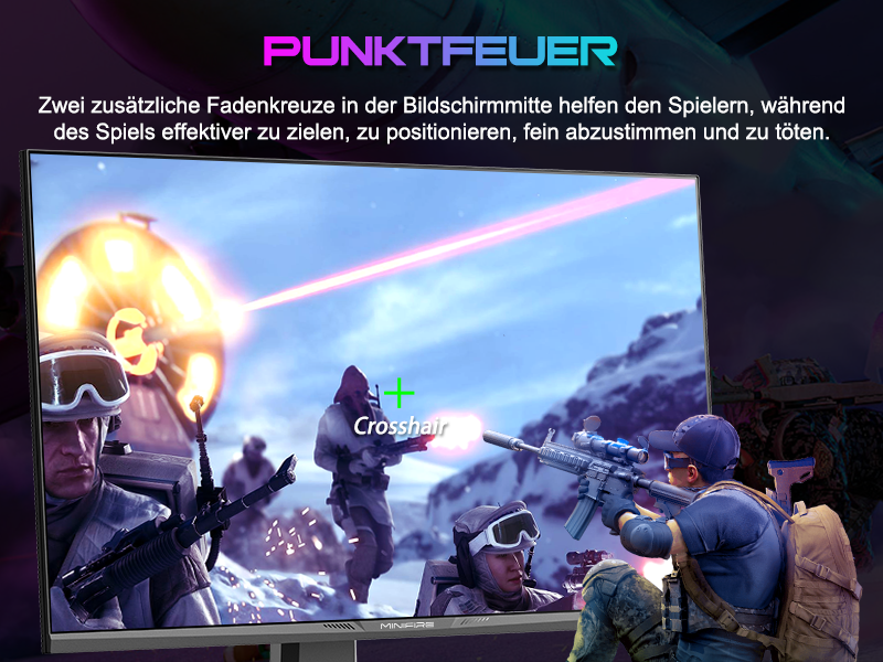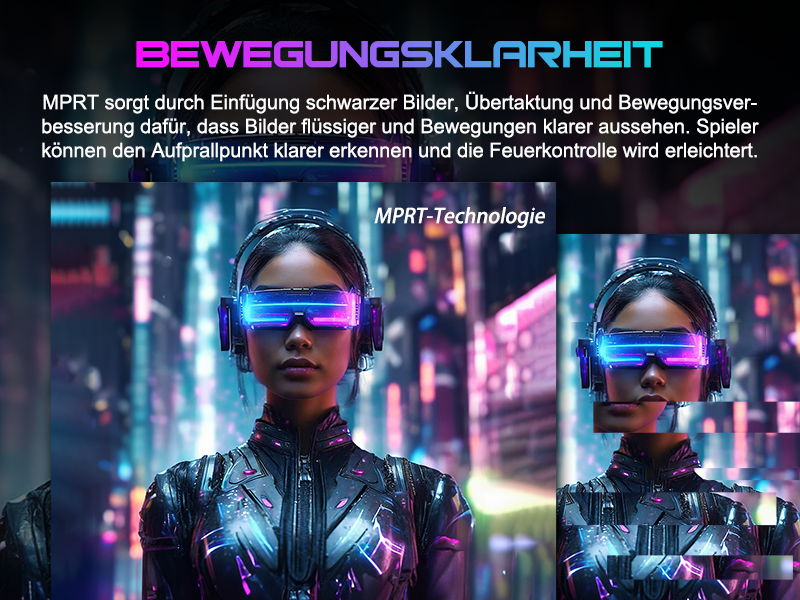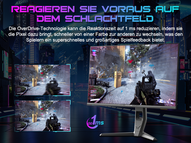 - Leistung: OD 1 ms Reaktionszeit, MPRT-Technologie für geringe Bewegungsunschärfe, Rauschunterdrückung, adaptive Synchronisierung, 320 Nits Helligkeit, Crosshair/RTS/FPS-Spieleassistent.