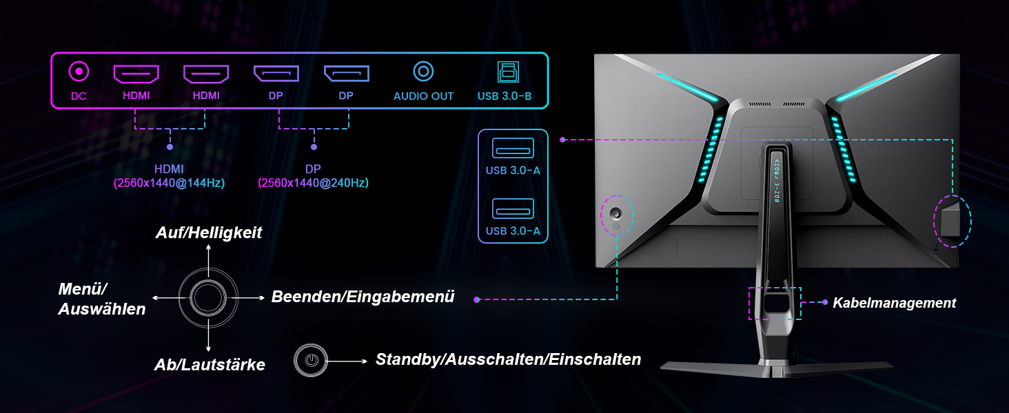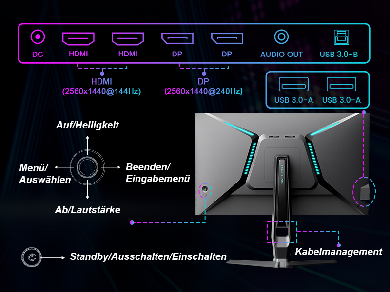 - Ausgang und Eingang: 2 W x 2 eingebaute Lautsprecher, 3,5-mm-Kopfhörerbuchse, 2 x DisplayPort 1.4 (bis zu 240 Hz), 2 x HDMI (bis zu 144 Hz), USB 3.0-A x 2, USB 3.0-B x1.