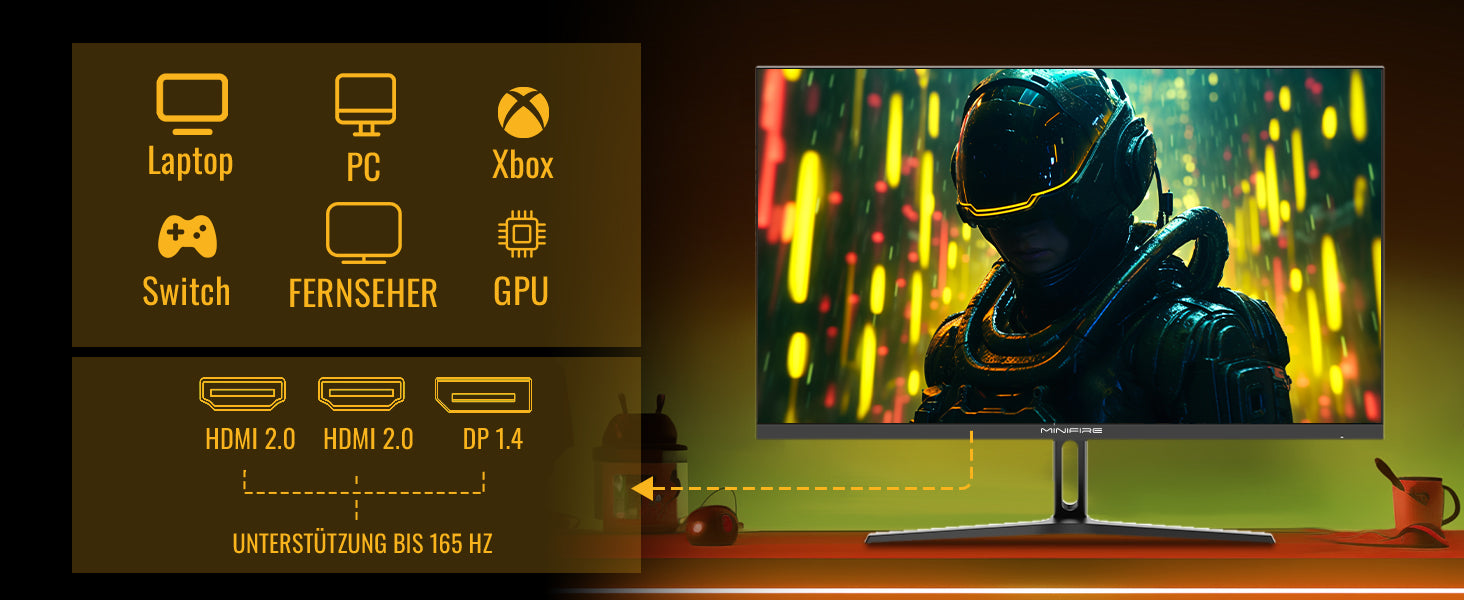 - Anschlüsse: 1 x DP 1.4 und 2 x HDMI 2.0 (HDMI-Kabel x 1 im Lieferumfang enthalten) – Audio-Buchse (keine integrierten Lautsprecher)