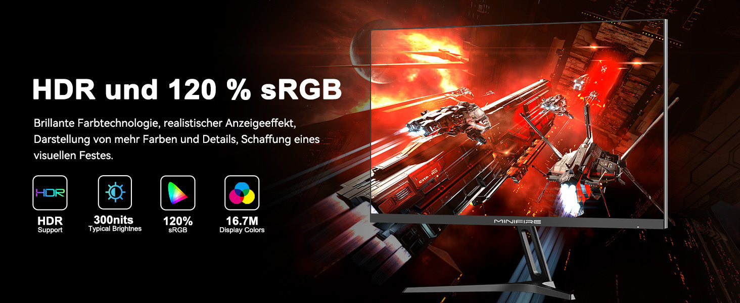 - Power: 10 bit colour depth panel. Anti-blue light and anti-flicker technology, HDR for improved colour rendering, 300 cd/m² peak brightness, 120% sRGB colour space