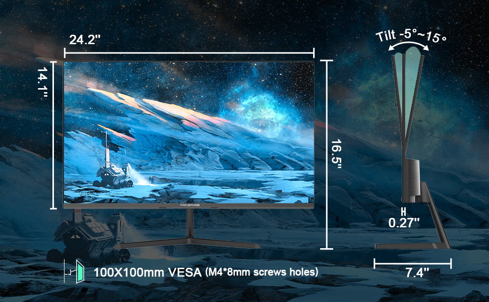 - Ergonomic design: V-shaped metal stand for space saving, tilt from -5° to 15°, viewing angle 178° horizontally and vertically; Low blue light technology, HDR and anti-flicker.