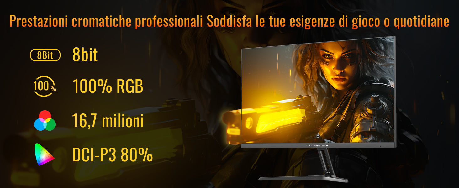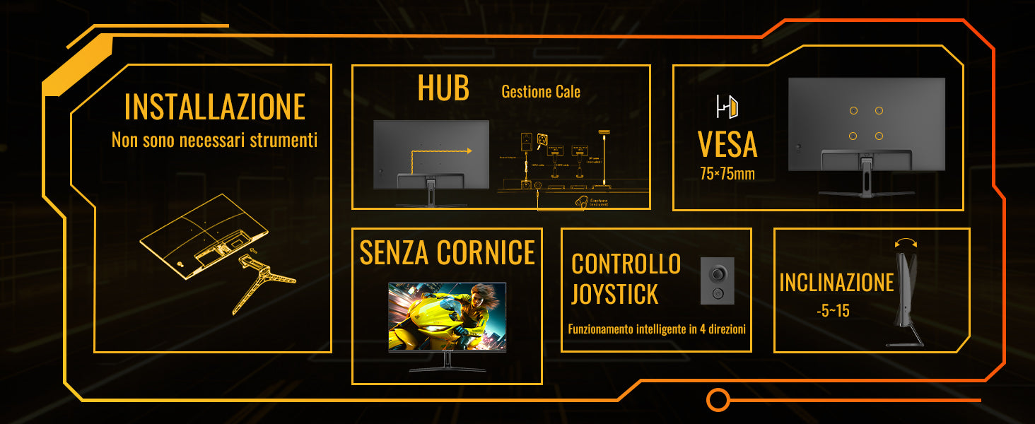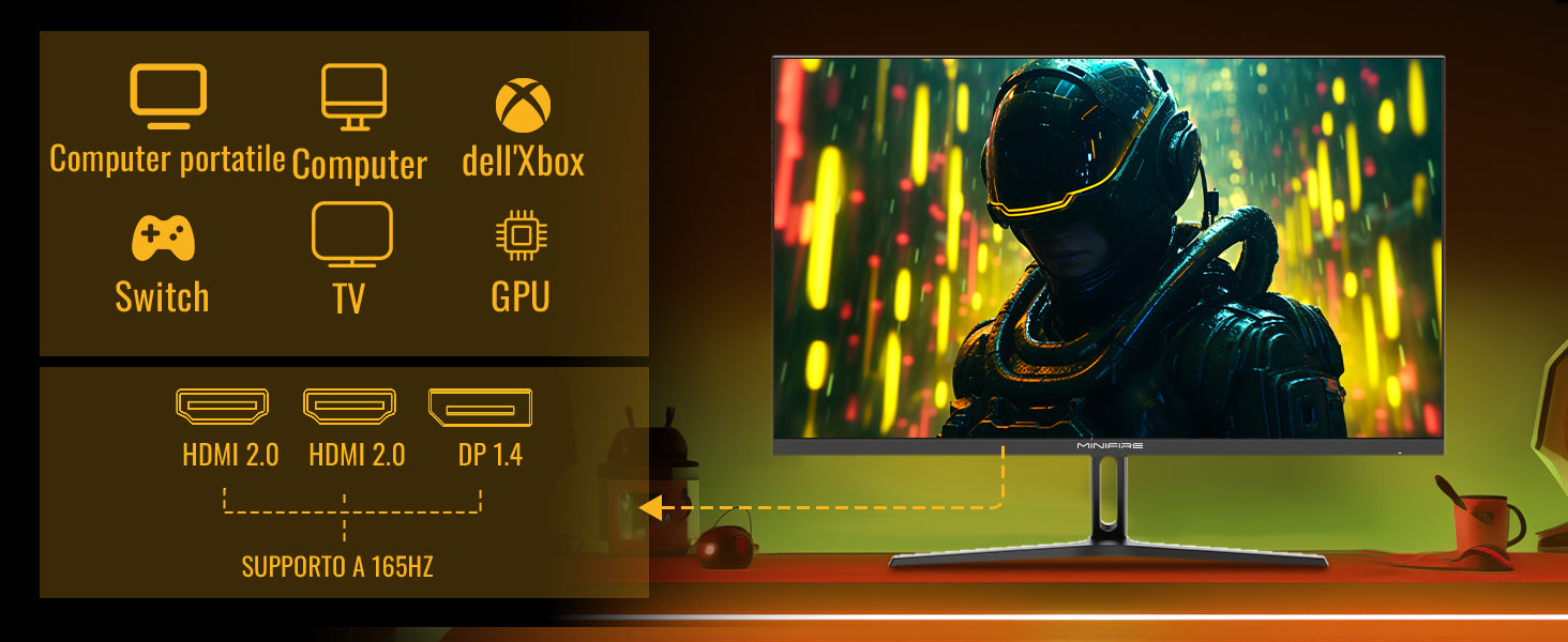 - Porte: 1 x DP 1.4 e 2 x HDMI 2.0 (cavo HDMI x 1 incluso) 丨 Jack audio (senza altoparlanti integrati)