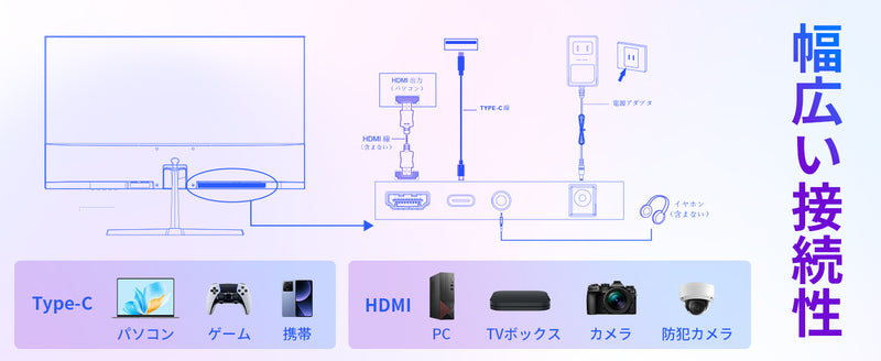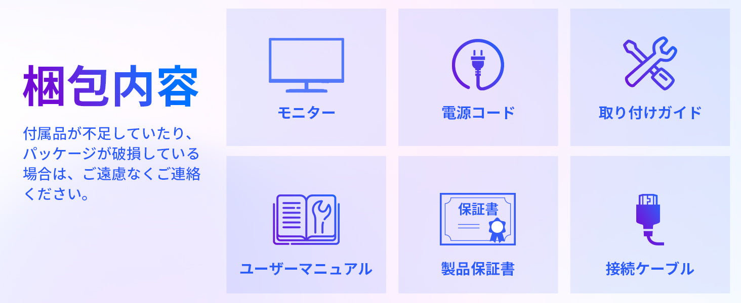 - [Input Terminal] HDMI x 1, VGA x 1, DP x 1, [Output Terminal] Audio out, Speaker, [Main Accessories] HDMI cable, adapter, stand, instruction manual