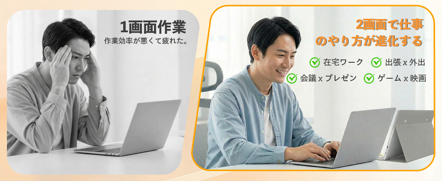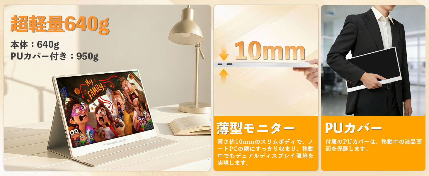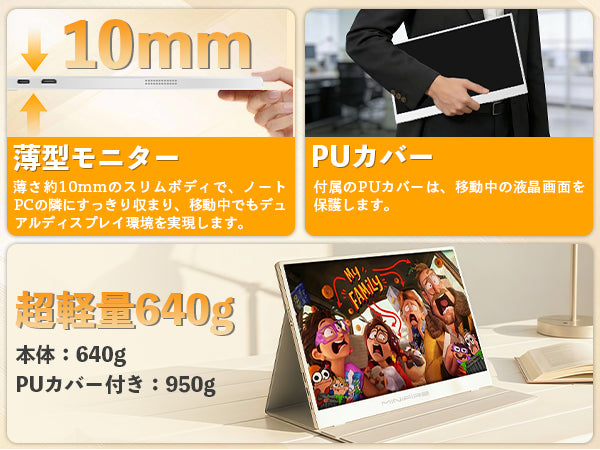 - 【Perfect Sub Display for Mobile Work】Equipped with a 15.6-inch full HD IPS screen, so you can instantly expand your laptop screen. Ultra thin and lightweight body with a thickness of about 0.4 inches (10.9 mm) and a weight of about 1.5 lbs (0.64 kg) and a PU cover that doubles as a stand, you can quickly build a comfortable dual display environment even at cafes or on business trips