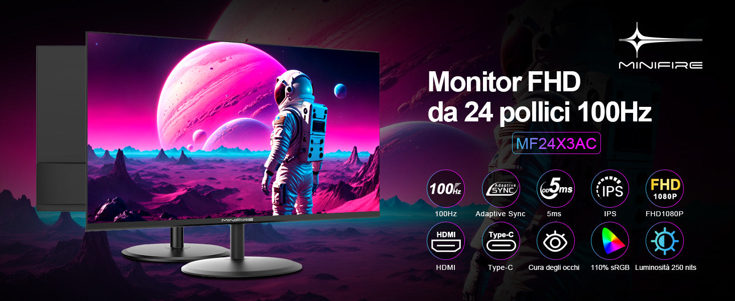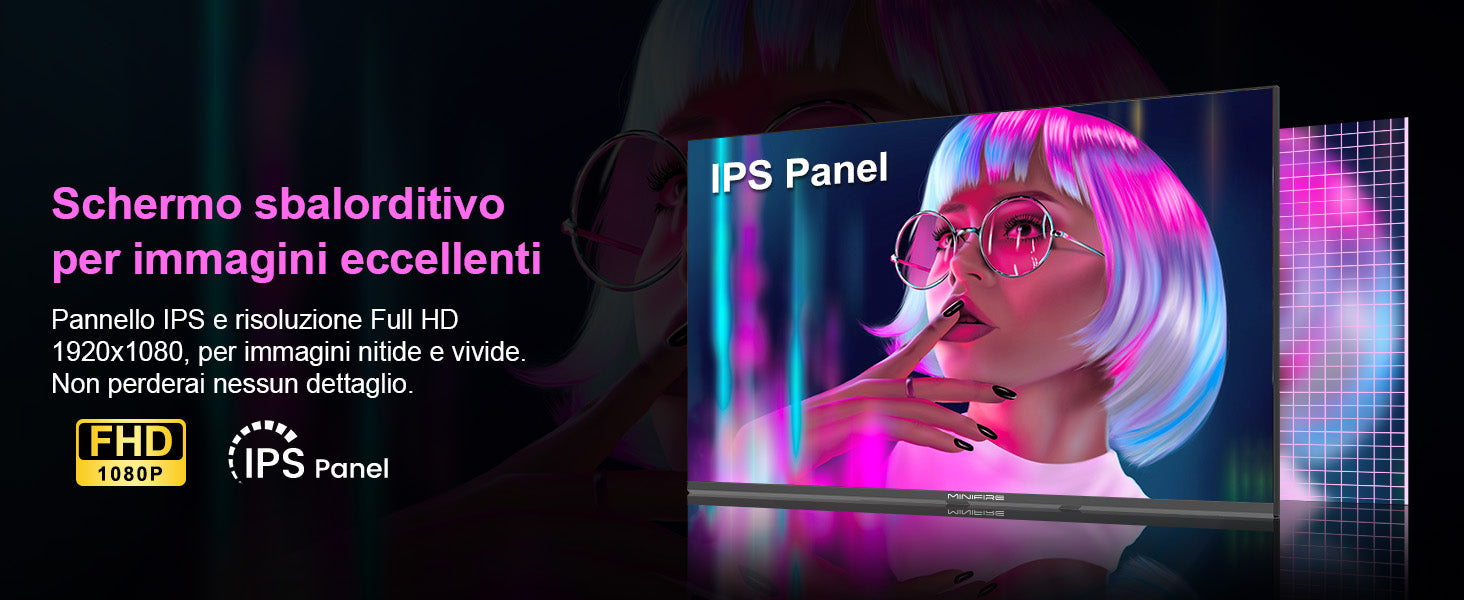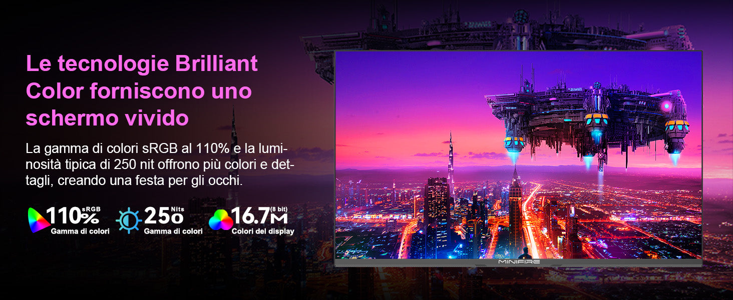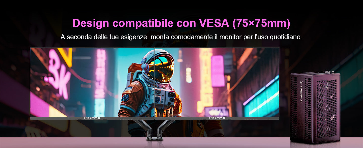 - [MULTIPORT] Il monitor Minifire si collega ad altri dispositivi tramite HDMI 1.4 e USB-C (cavo HDMI e cavo USB-C inclusi). Il monitor viene montato utilizzando un supporto VESA universale da 75x75 mm