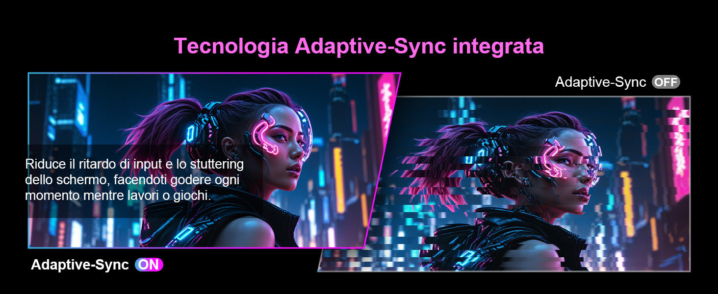 - [ESPERIENZA VISIVA COINVOLGENTE] Lo schermo è dotato di tecnologia IPS per uso domestico, di gioco o in ufficio. Le eccezionali prestazioni cromatiche offrono neri profondi e bianchi vibranti, mentre la tecnologia Adaptive-Sync porta la tua esperienza a un livello superiore.