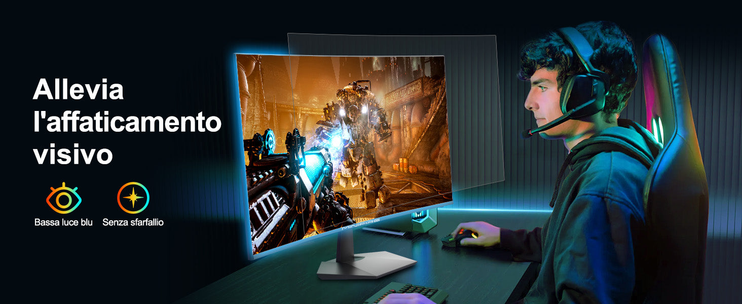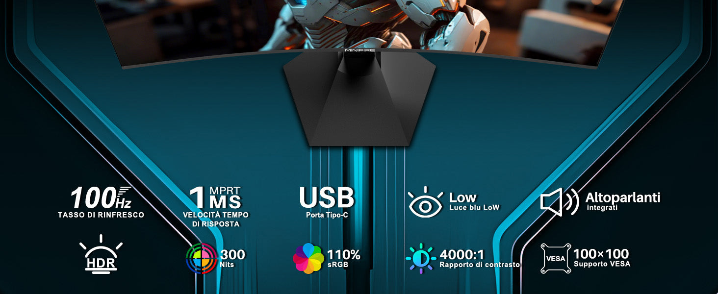 - Prestazioni : 100 Hz di frequenza di aggiornamento | MPRT 1 ms di tempo di risposta丨Adaptive Sync | Riduzione della luce blu | Senza sfarfallio | Altoparlanti incorporati | Soddisfa le esigenze del gioco e dell'ufficio, allevia l'affaticamento degli occhi e protegge la vostra salute