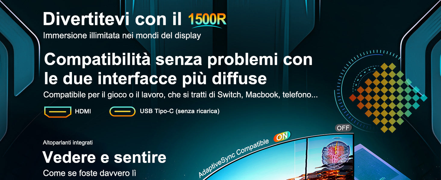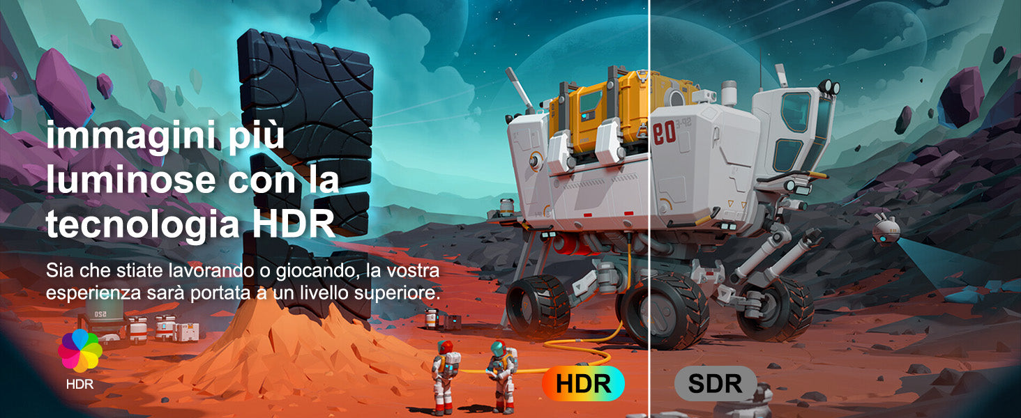 - Colori dello schermo: sRGB 110 %丨HDR 丨300 nits |16.7M (8 bit )| 4000:1 rapporto di contrasto | 300 cd/m² luminosità | Offre colori ricchi sullo schermo