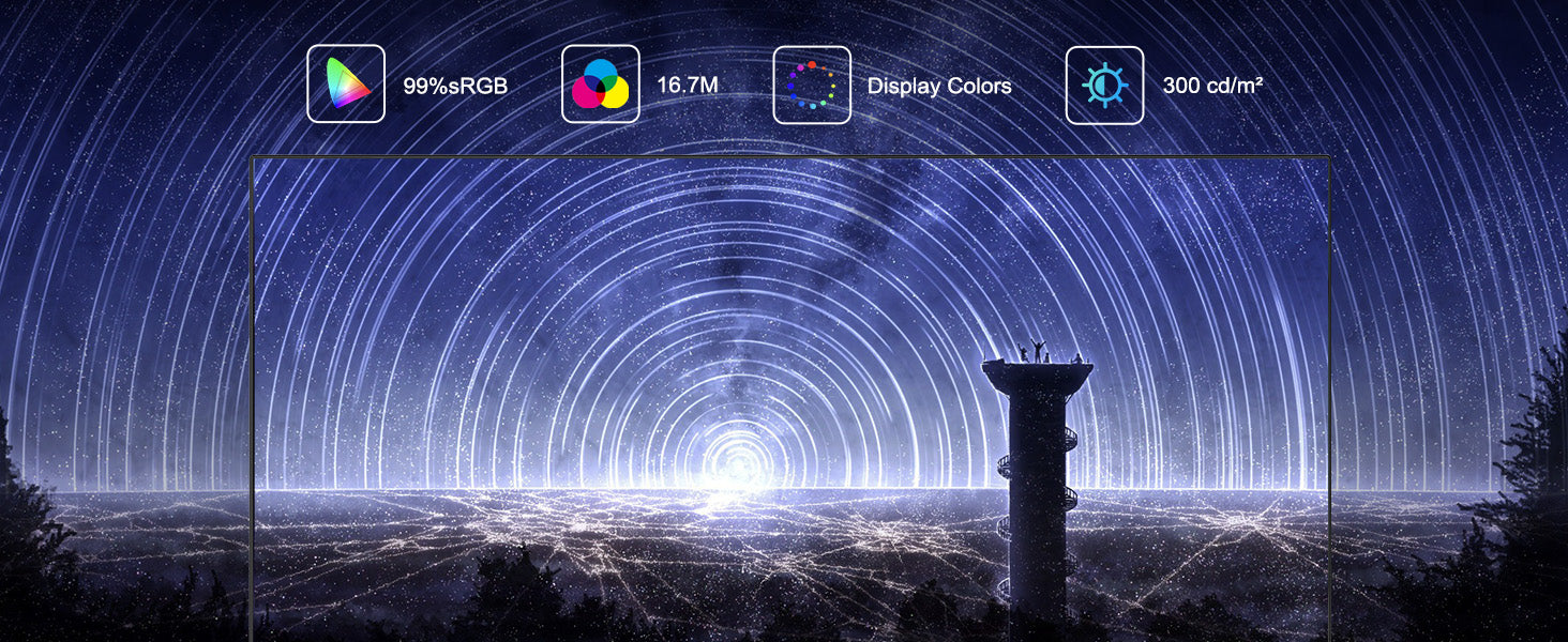- Temps de réponse: 5ms | Fréquence de Rafraîchissement: 100Hz | Luminosité: 300NITS | Angle de vue: 178 ° | Gamme de Couleurs: SRGB 99%.