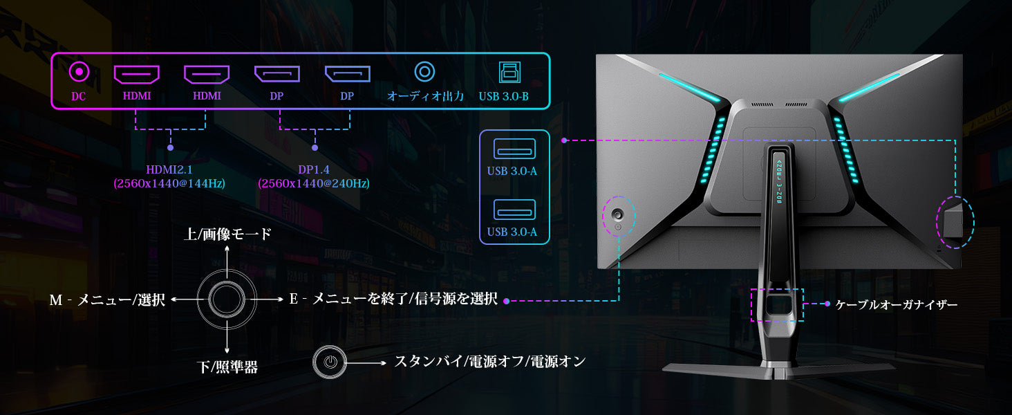 - [入力端子] HDMI 2.0 x 2、DP 1.2 x 2、USB 3.0-A x 2、USB 3.0-B X 1 [出力端子]オーディオ出力、スピーカー、[メインアクセサリ] DPケーブル、アダプター、スタンド、取扱説明書