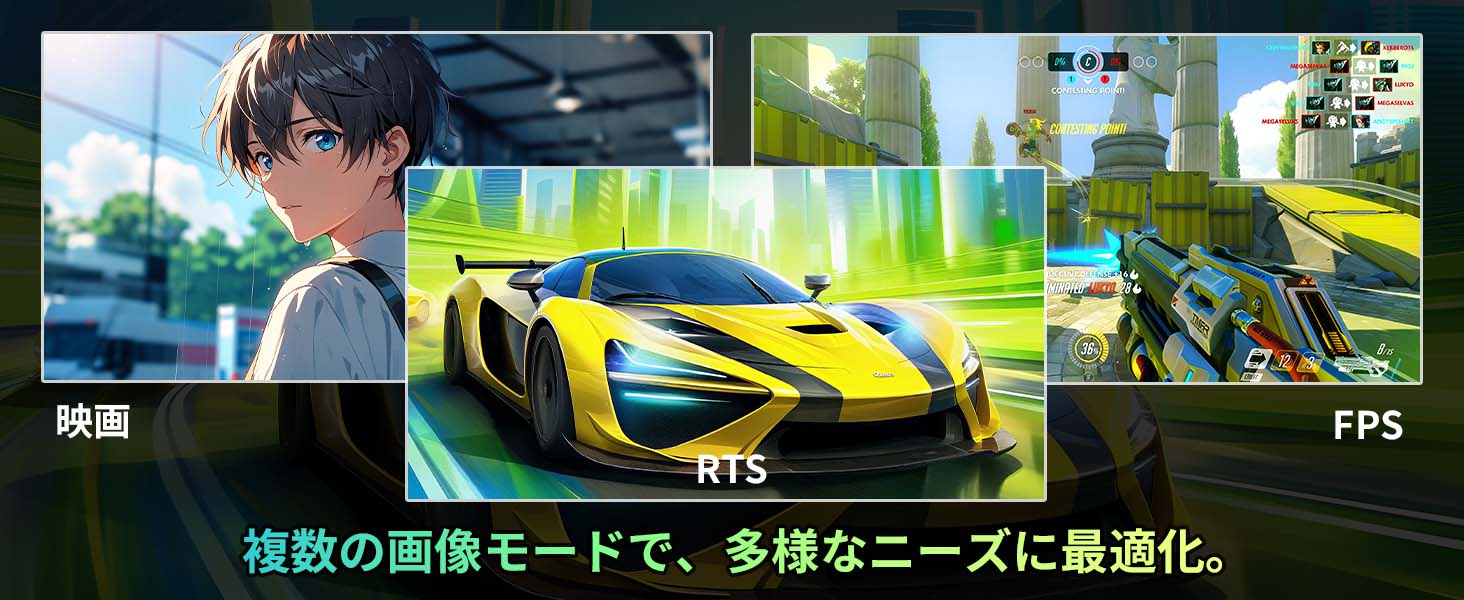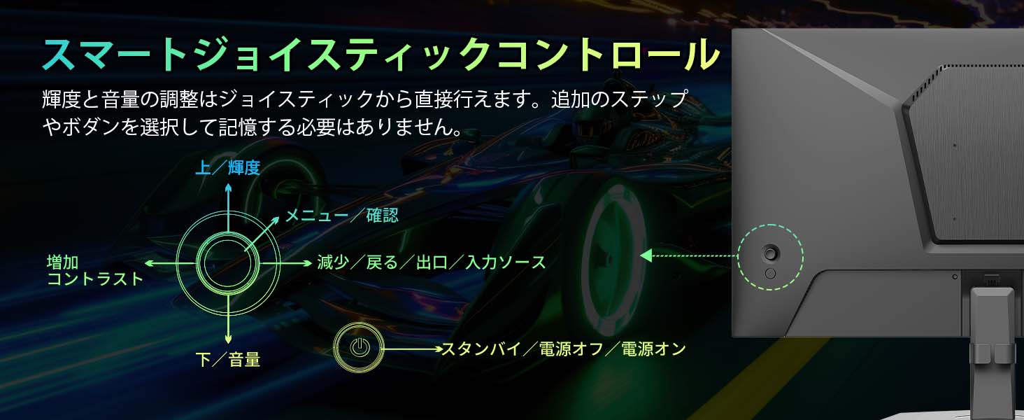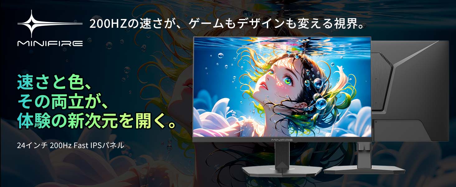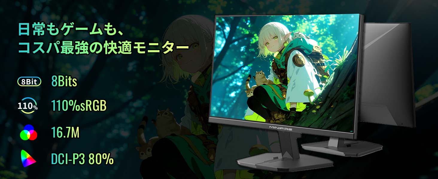 - [画面サイズ] 24インチ FastIPS モニター 、[最大解像度] 1920×1080、[アスペクト比] 16:9、[コントラスト比]1000:1、[輝度] 300cd/㎡ 、[色域] DCI-P3 80%;sRGB 110%、[色深度] 16.7万色、8Bits。
