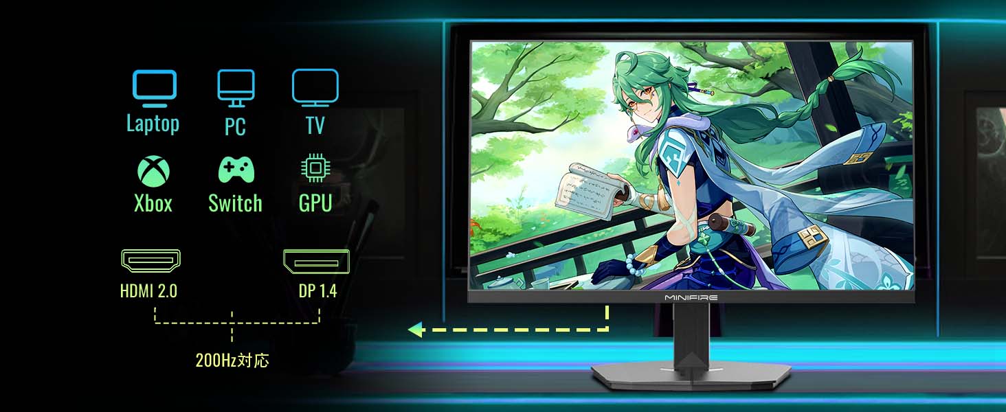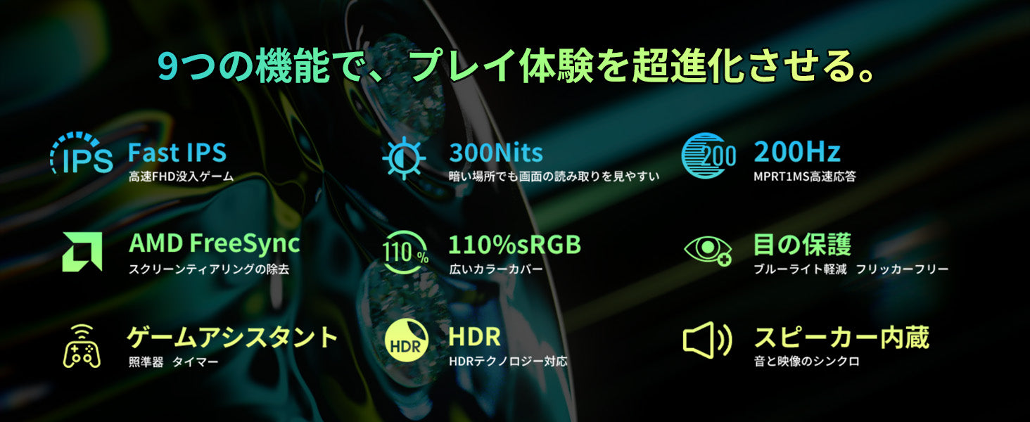 - [リフレッシュレート]200Hz、[応答速度] 5ms(OD/MPRT1ms)、[傾斜角度調整] 前後(-5°から15°+/-2°)、178°広視野、アイケア、ブルーライト軽減、フリッカーフリー、AMD FreeSync、ゲームプレイアシス VESA対応(75mm x75mm)。