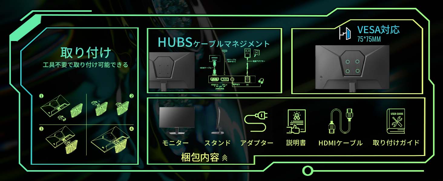 - [入力端子] HDMI 2.0×1、DP1.4×1、[出力端子] オーディオ出力、スピーカー、[主な付属品] HDMIケーブル、アダプター、スタンド、取扱説明書。(DPケーブルは付属しません)