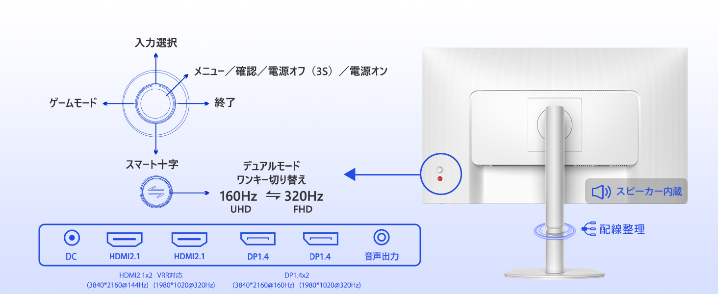 - 2つのHDMI 2.1(FRL)入力端子を装備。PS5やXbox Series Xなどの最新ゲーム機から、4K高解像度と高リフレッシュレート(最大4K 120Hz)の信号をロスなく受け取り、可変リフレッシュ率(VRR)技術と連携させることで、常に滑らかで途切れない、画面のティアリングやカクつきのない究極のゲーム映像を実現します。次世代ゲームのパフォーマンスを最大限に引き出す、最適な環境を提供します。DP1.4x2もあります。[出力端子] Audio out、スピーカー(2Wx2)