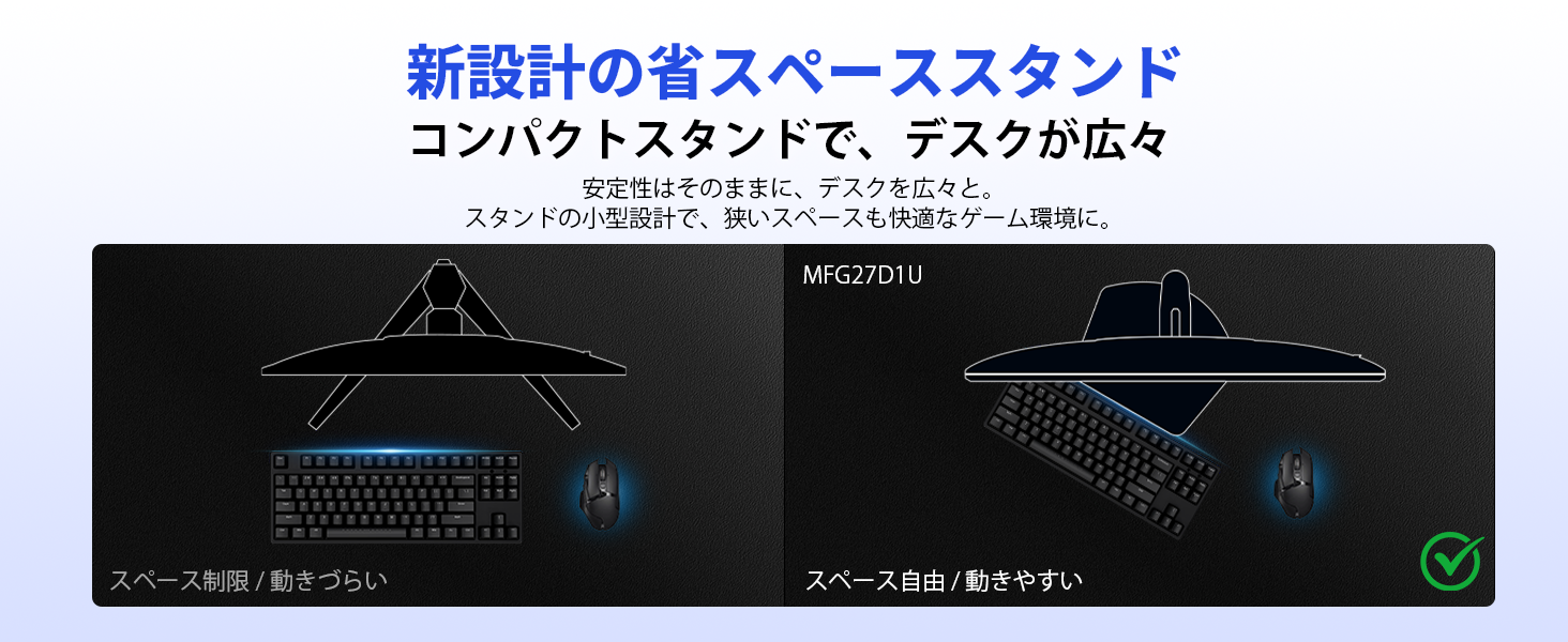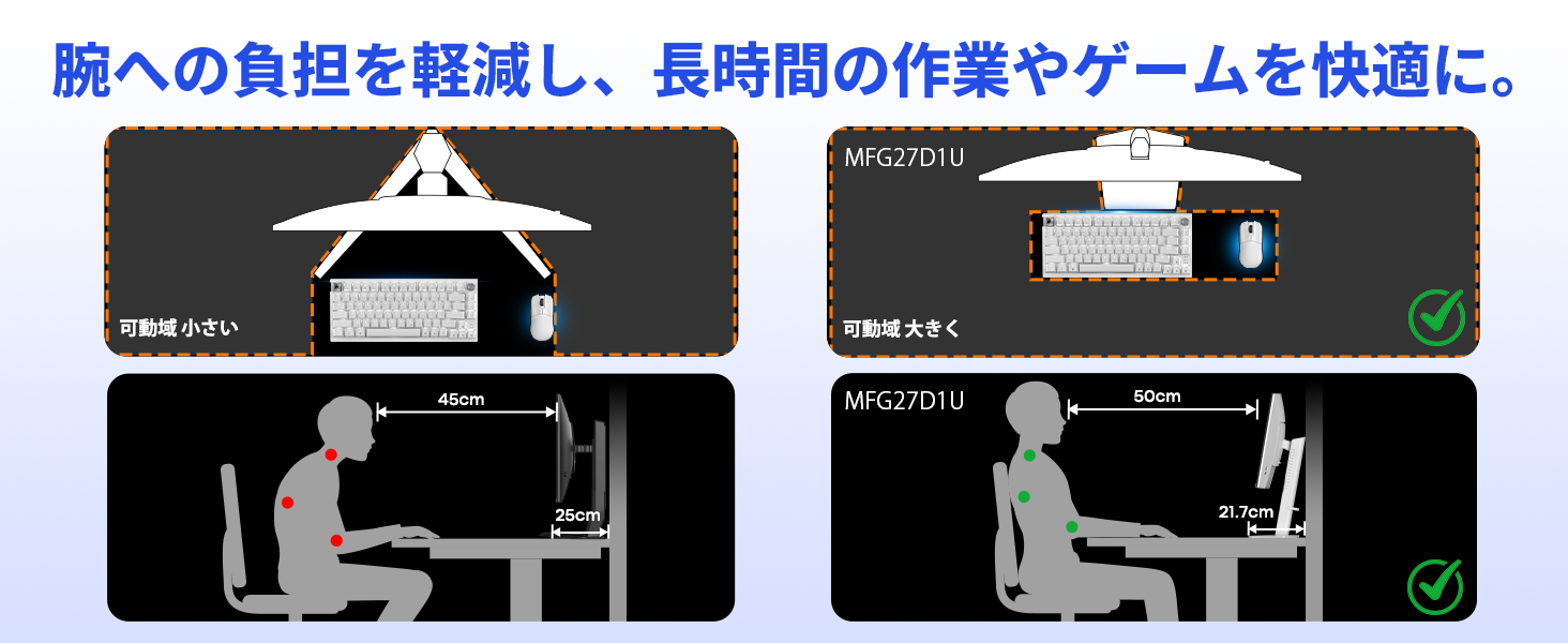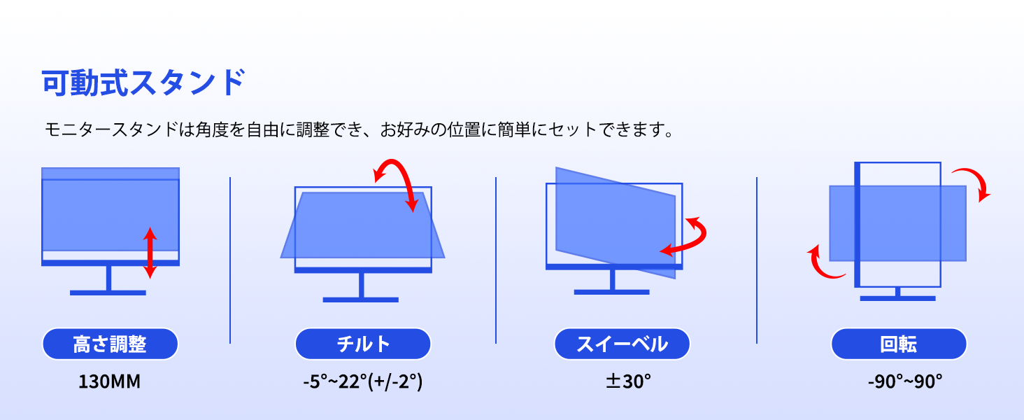 - フルアジャスタブルなエルゴノミックスタンドで、姿勢と視野を最適化。圧倒的な省スペース設計。高さ調節(130mm)、左右回転(±30°)、前後チルト(-5°〜+22°)、さらに90°の縦回転(ピボット)をサポートする多機能スタンドを採用。どんな体格や姿勢にも合わせて、疲れにくい理想の視野角を簡単に構築できます。また、スタンドの優れた収納性とコンパクトな設計により、デスク上の有効スペースを大幅に確保。