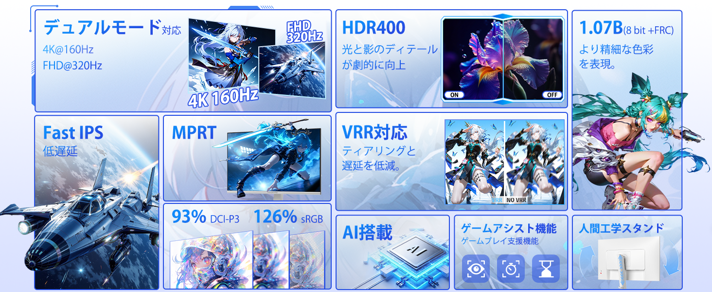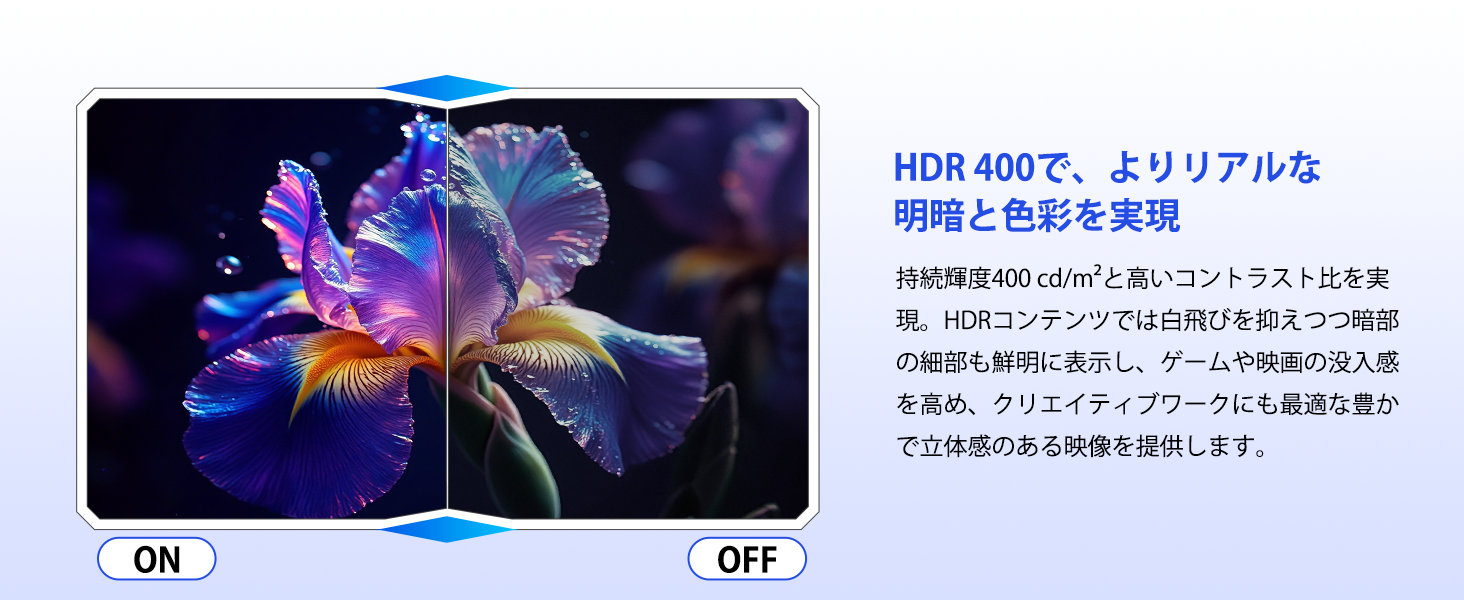 - 卓越した表示性能:豊かでリアルな色彩、鮮明なコントラスト、臨場感あふれるHDRを実現。 16:9のスタンダードな画面比率は、あらゆるゲームや映像コンテンツに最適です。1000:1のコントラスト比と400cd/㎡の高輝度により、深みのある黒と明るい部分のディテールをくっきり再現。広色域カバー率(DCI-P3 93%, sRGB 126%)と10.7億色(8bit+FRC)表現が、極めて滑らかで豊かな色彩の階調を実現し、VESA DisplayHDR 400対応で、より幅広いダイナミックレンジのHDRコンテンツを楽しめます。映像編集、高画質ゲーム、映画鑑賞まで、あらゆるシーンで真に迫る究極のビジュアル体験を提供します。