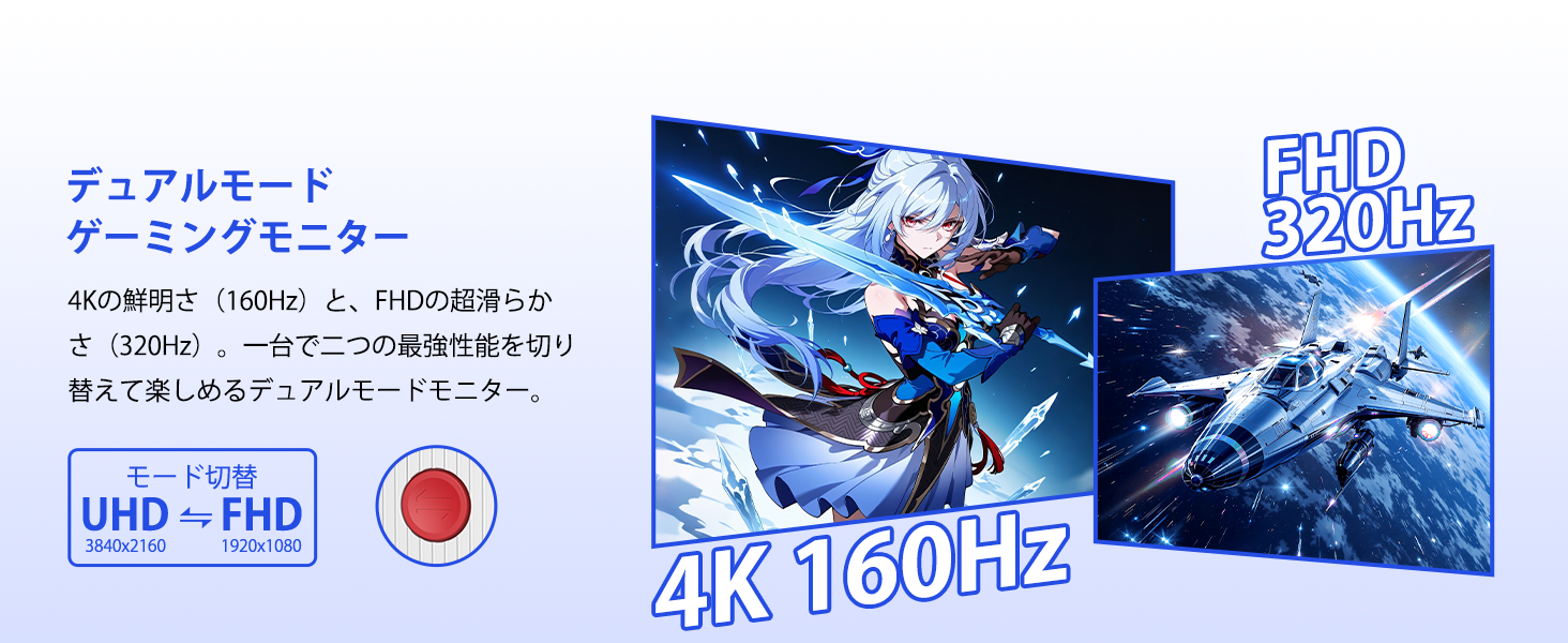 - 「4K/FHD ワンタッチ切替」で、画質と応答速度の両方を一台で究極まで追求。 ボタン一つで、高精細な「4K 160Hzモード」と超高速な「FHD 320Hzモード」を瞬時に切り替え。PS5や大作ゲームの美麗な世界観に深く没入できる一方、競技FPSでは圧倒的な滑らかさと超低遅延で反射神経を最大限に活かせます。シーンに応じて最高のパフォーマンスを即時に引き出す、次元の違うゲーミング体験を実現するデュアルモードが最大の特長です。