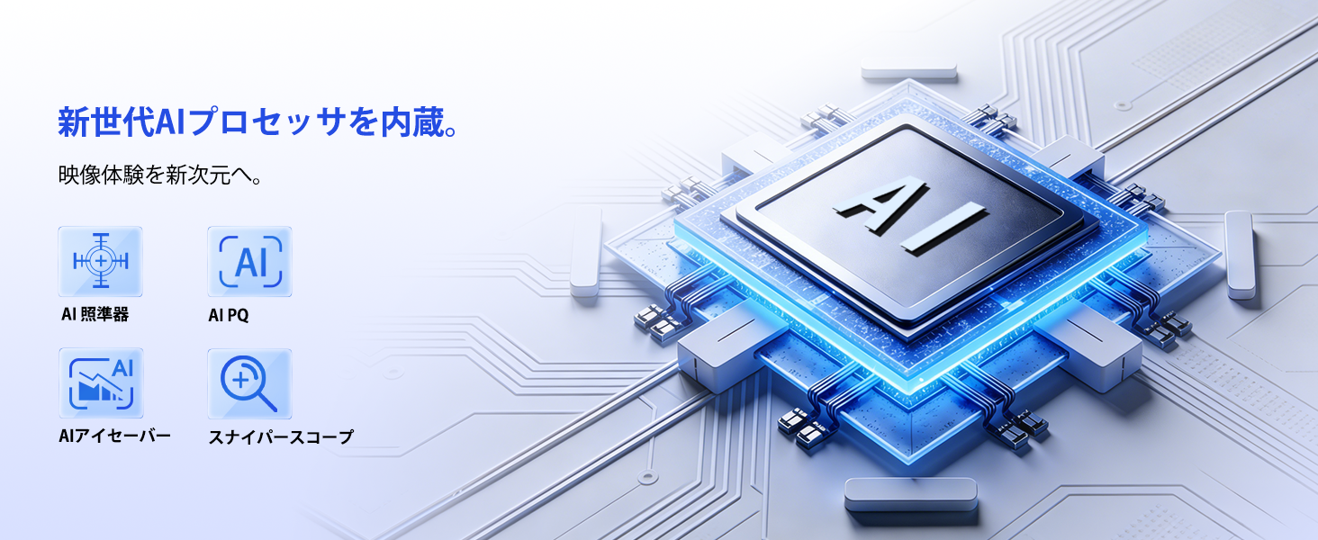 - AIが周囲の環境光を自動検知し、最適な輝度と色温度に調整するAI自動調光で目の疲れを軽減。AI画質エンハンスがコンテンツをリアルタイム分析し、コントラスト・彩度・シャープネスを強化して常に鮮明な映像を提供。さらに、FPSゲームではAI照準器が背景色に応じて自動的に最適な色の照準をオーバーレイ表示し、視認性を劇的に向上。アイケア、Tüvブルーライト軽減、フリッカーフリー